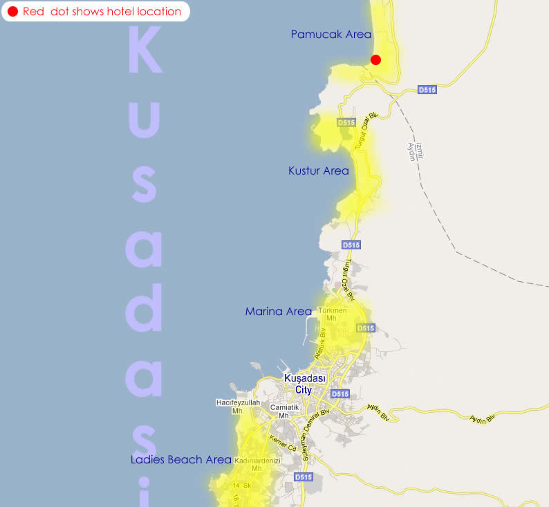 Selcuk 8 km, Kusadasi 10 km. Izmir Adnan Menderes Airport 75 km. Near ruins, private beach.