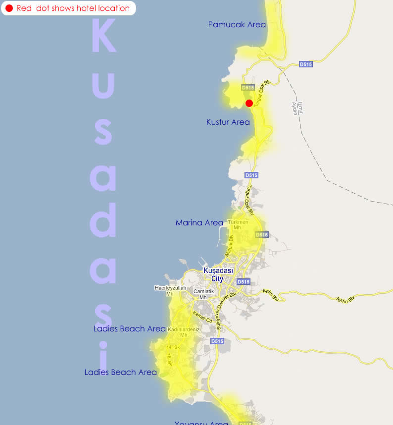 Adnan Menderes Airport 65 km. Near ruins, at the beach, public beach.